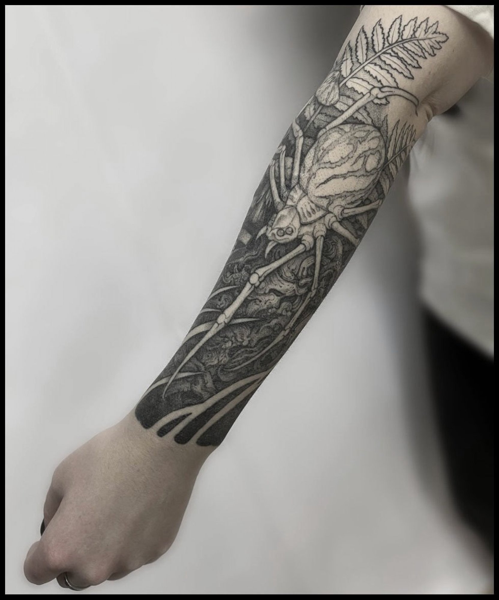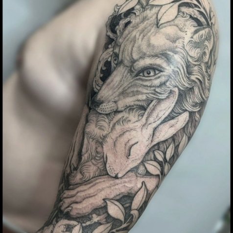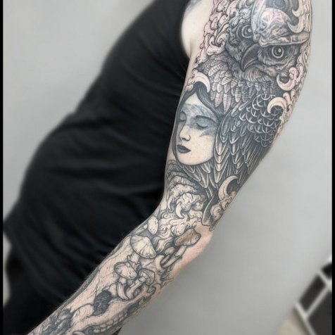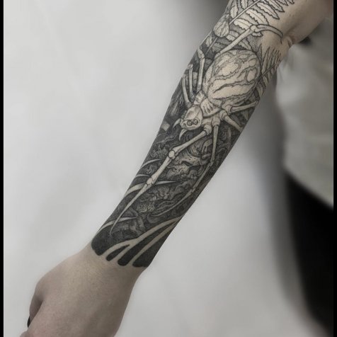 • Мне особенно близки природные мотивы, где травы, корни, грибы и ягоды служат фоном для более крупных объектов — зверей, птиц, черепов или чего душа пожелает. Также нравятся дизайны с органикой и крупные формы с детализированными фрагментами.